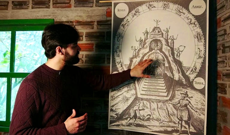Iremos abordar o funcionamento oculto do cosmos e do homem, penetrando no pensamento místico e filosófico, a partir da decifração de símbolos, emblemas, tratados, chaves, epigramas e iconografia alquímica (incluindo obras clássicas como Atalanta Fugiens, de Michael Maier, entre outras).
